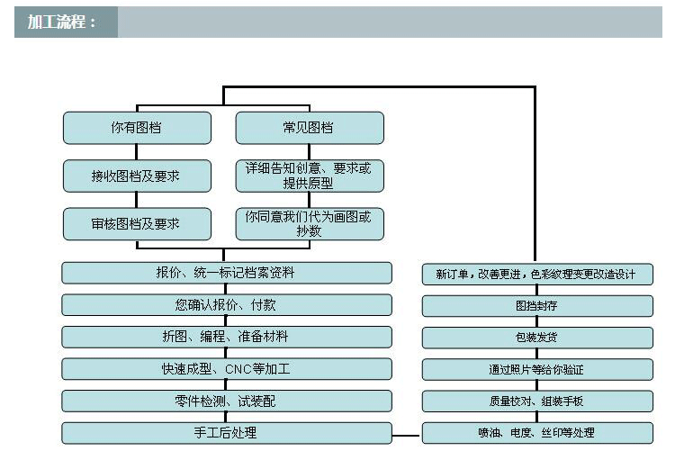 编程→CNC→装配(清角)→QC→打磨→喷油(熏蒸)→移印(丝印,镭雕)→QC→包装